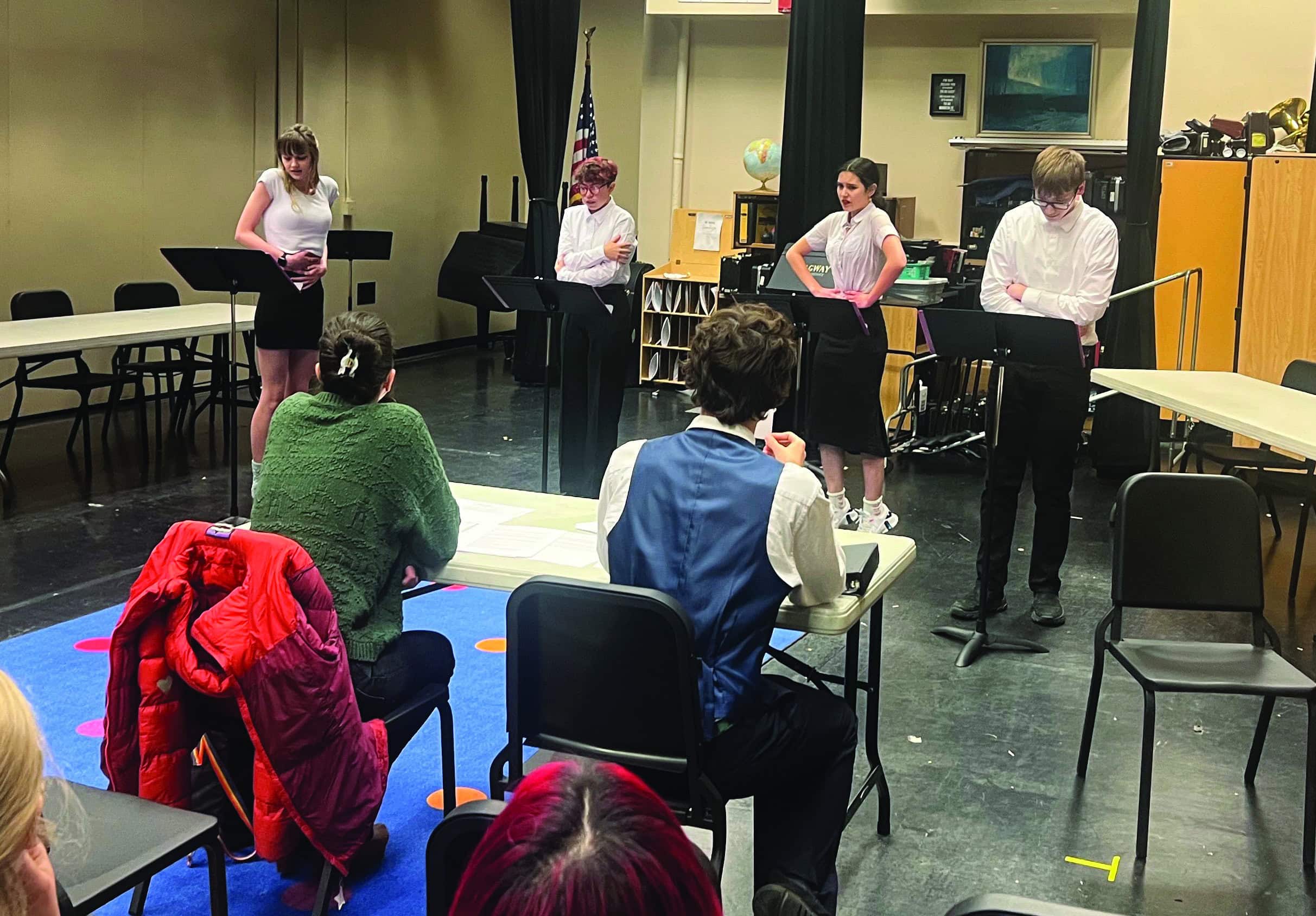 The SHS Readers Theatre team performs during the finals round in the school music room. From left are Evelyn Borst, Mina Yee, Lina Hischer, and Sam Munson. Photo by Jeff Brady